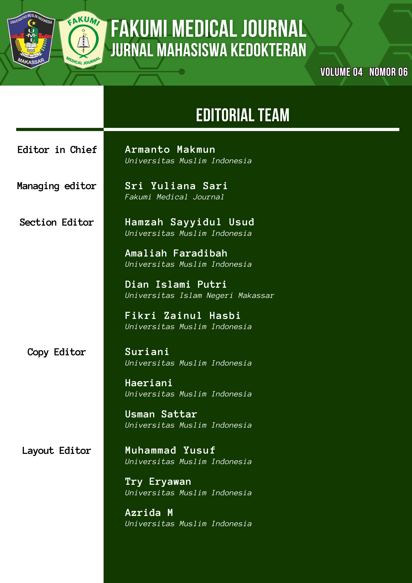 Fakumi Medical Journal: Jurnal Mahasiswa Kedokteran adalah publikasi ilmiah yang terbit setiap bulan sekali yang menggunakan sistem peer-review untuk seleksi artikel. Fakumi Medical Journal menerima artikel penelitian yang original (original article / research paper) yang relevan dengan bidang ilmu Kedokteran. Fakumi Medical Journal juga menerima tinjauan pustaka, laporan kasus, ceramah ilmiah, book review, dalam bentuk surat kepada redaksi berbahasa Indonesia atau Inggris, dengan syarat belum pernah dipublikasikan sebelumnya di tempat lain. FAKUMI Medicala Journal dibuat tahun 2021 oleh Fakultas Kedokteran, Universitas Muslim Indonesia, Makassar dengan e-ISSNĀ 2808-9146.