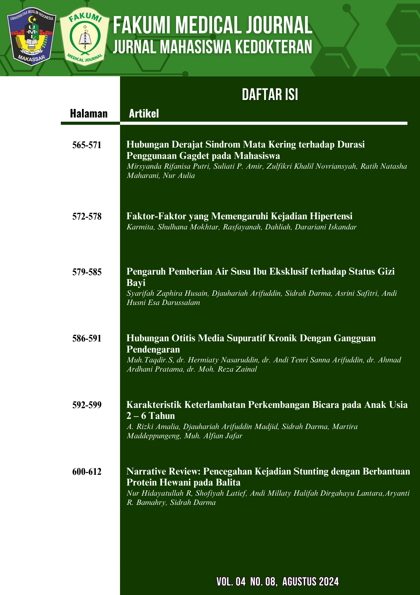 Fakumi Medical Journal: Jurnal Mahasiswa Kedokteran adalah publikasi ilmiah yang terbit setiap bulan sekali yang menggunakan sistem peer-review untuk seleksi artikel. Fakumi Medical Journal menerima artikel penelitian yang original (original article / research paper) yang relevan dengan bidang ilmu Kedokteran. Fakumi Medical Journal juga menerima tinjauan pustaka, laporan kasus, ceramah ilmiah, book review, dalam bentuk surat kepada redaksi berbahasa Indonesia atau Inggris, dengan syarat belum pernah dipublikasikan sebelumnya di tempat lain. FAKUMI Medicala Journal dibuat tahun 2021 oleh Fakultas Kedokteran, Universitas Muslim Indonesia, Makassar dengan e-ISSN 2808-9146.